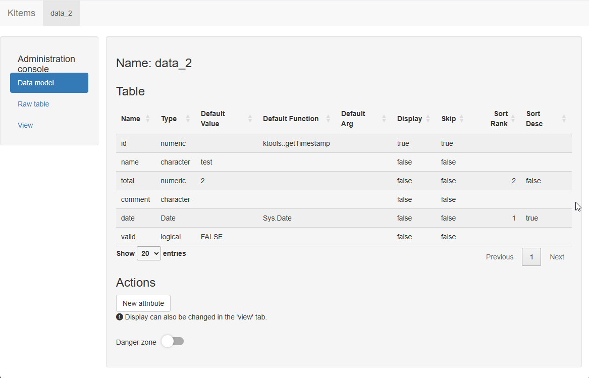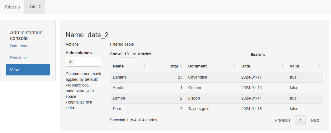 The view section displays the item table as it will be available from the filtered_view_widget() function: