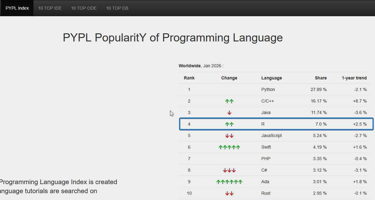 Whether in terms of available online content (TIOBE index) or web searches performed (PYPL index), R is making progress: